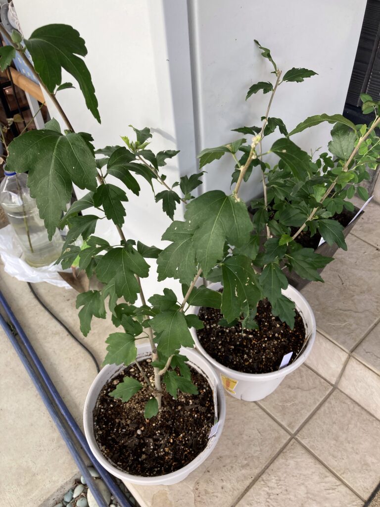 鉢植えのムクゲは、夏期は鉢底から流れ出てくるまでたっぷりと水やりします。
