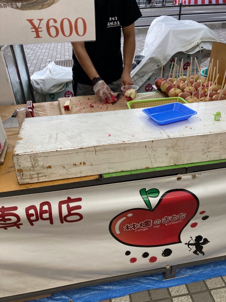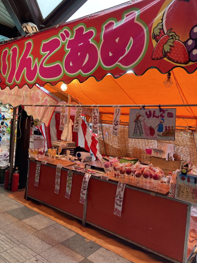 出ていたお店は 定番でカステラ・焼きそば・たこ焼き・リンゴ飴・はしまき などなど