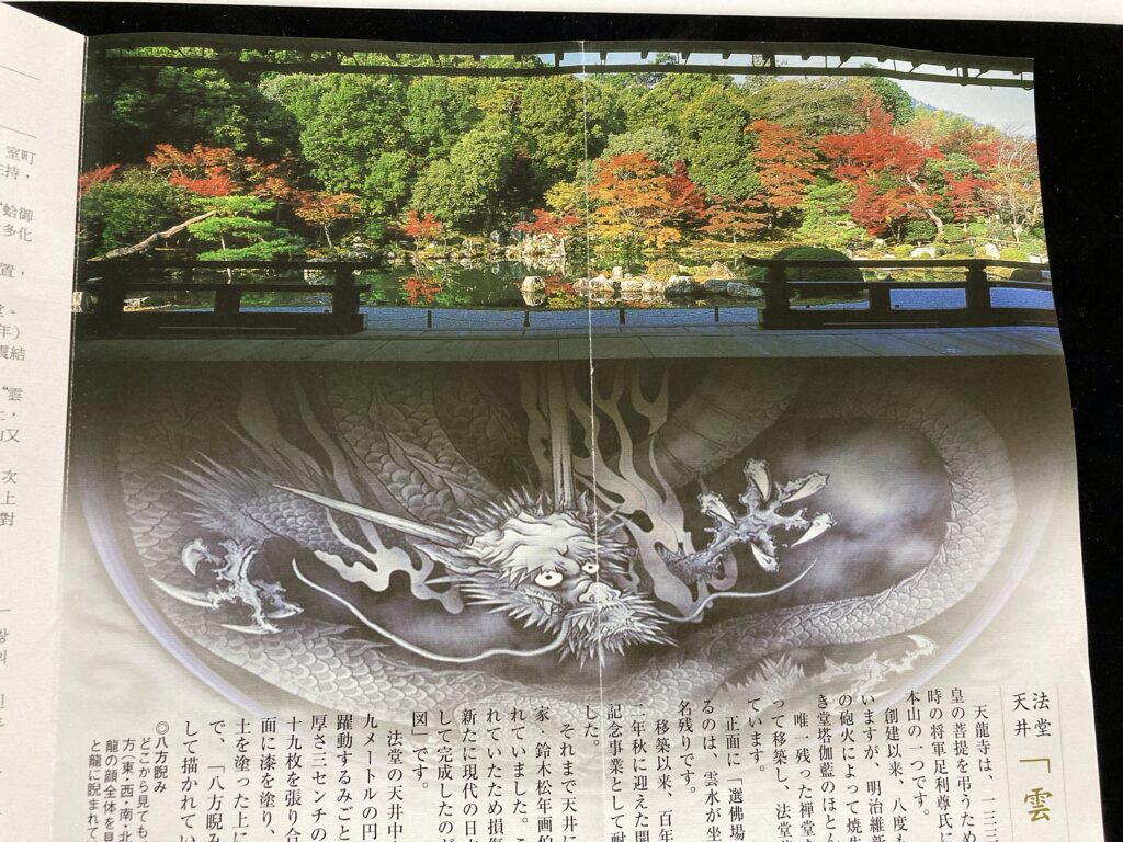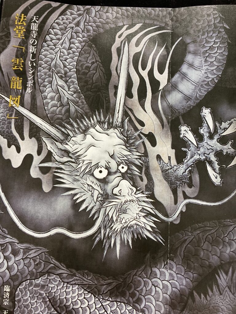 法堂(はっとう)天井に平成9年(1997)天龍寺開山夢窓国師650年遠諱記念事業として日本画家加山又造画伯(1927~2004)により「雲龍図」が描かれた。