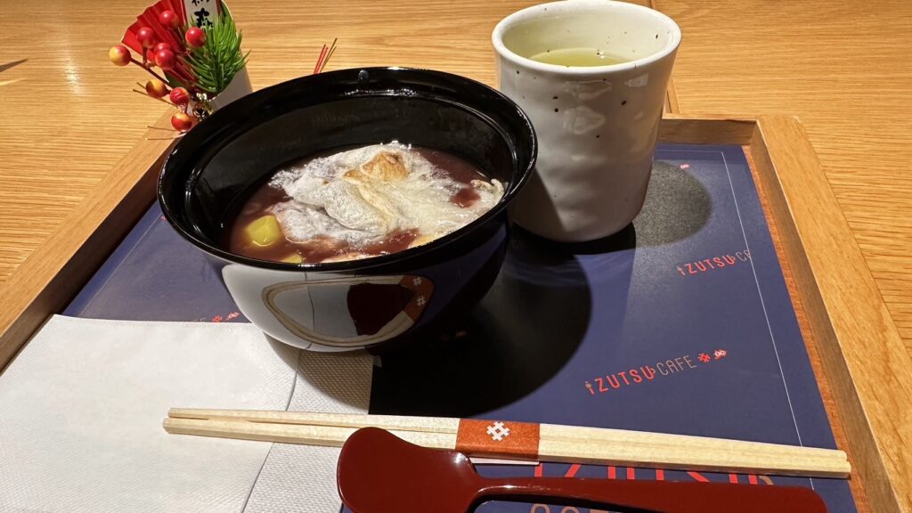 「花びら餅」のおともには、無病息災を祈って元旦に飲む大福茶(=お茶屋さんによって茶葉の種類が変わる新年のお茶)を一緒に飲まれることをおすすめします