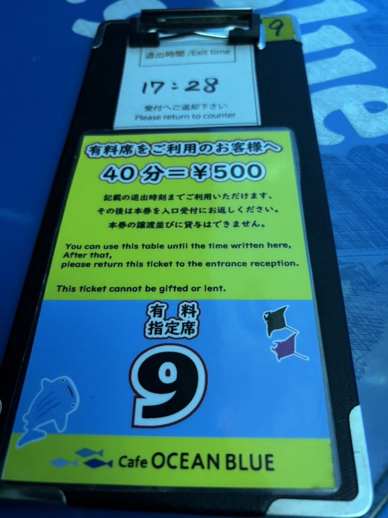 水槽に一番近い9席は40分500円と有料ですが、大型水槽で優雅に泳ぐジンベエザメを眺めながらコーヒーを飲み、ゆっくりと過ごす時間はまさに癒しです。😍