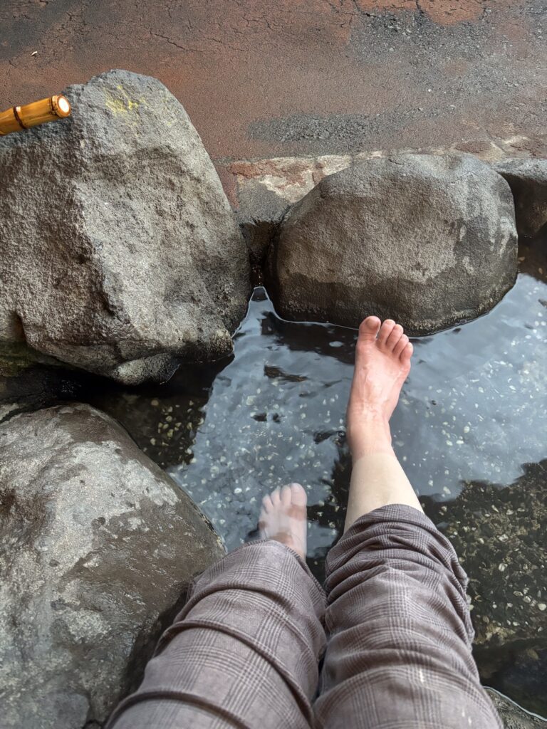 足湯の近くに源泉があり 足をつけていると 熱いお湯が流れてきて