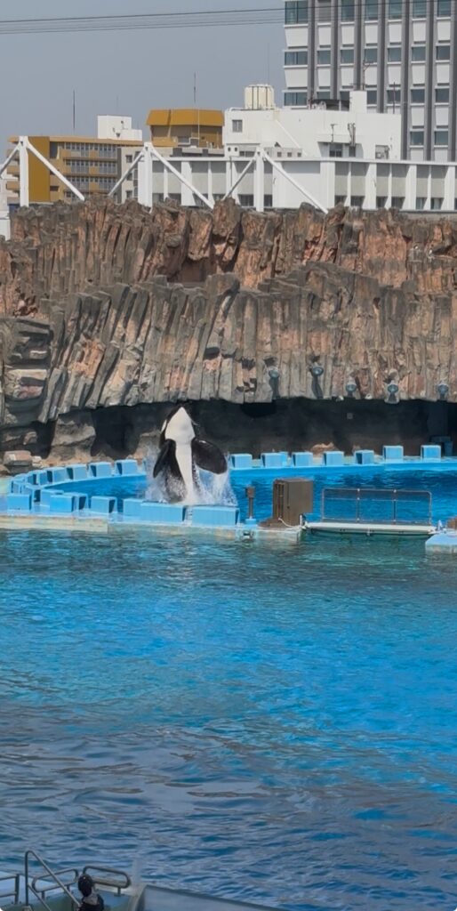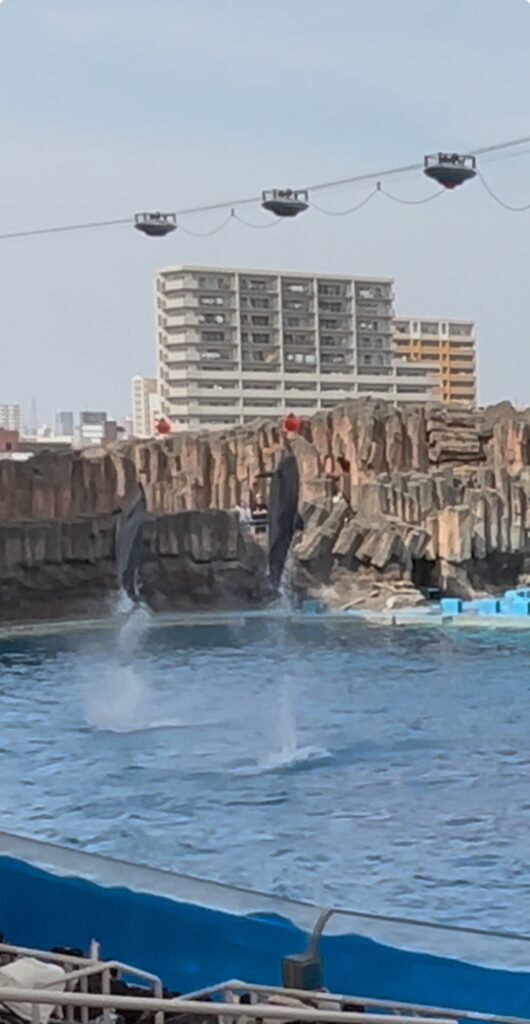 日本最大のプール(幅60m、奥行き30m、最大水深12m)をイルカたちが泳ぎ一斉にジャンプする姿は圧巻だそうです。