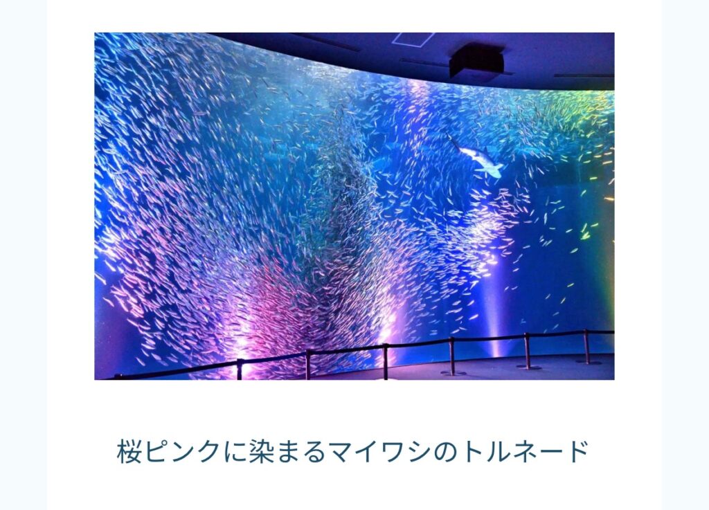 2025年3月11日(火)より、「マイワシのトルネード」を、うららかな春のイメージに合わせたBGMと水中照明を加えて演出したバージョンになったそうです。